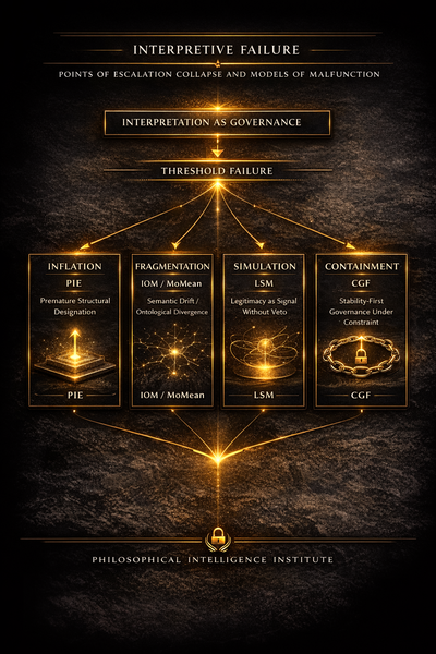 Interpretation functions as governance: it assigns structural meaning, classifies issues, designates legitimacy, and defines systemic conditions. When threshold discipline fails, four distinct failure patterns emerge: