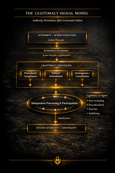 The Legitimacy Signal Model (LSM) describes a structural condition in which legitimacy no longer functions as a constraint on authority, but persists as a signalling system that stabilises power, absorbs dissent, and enables continuity without veto.